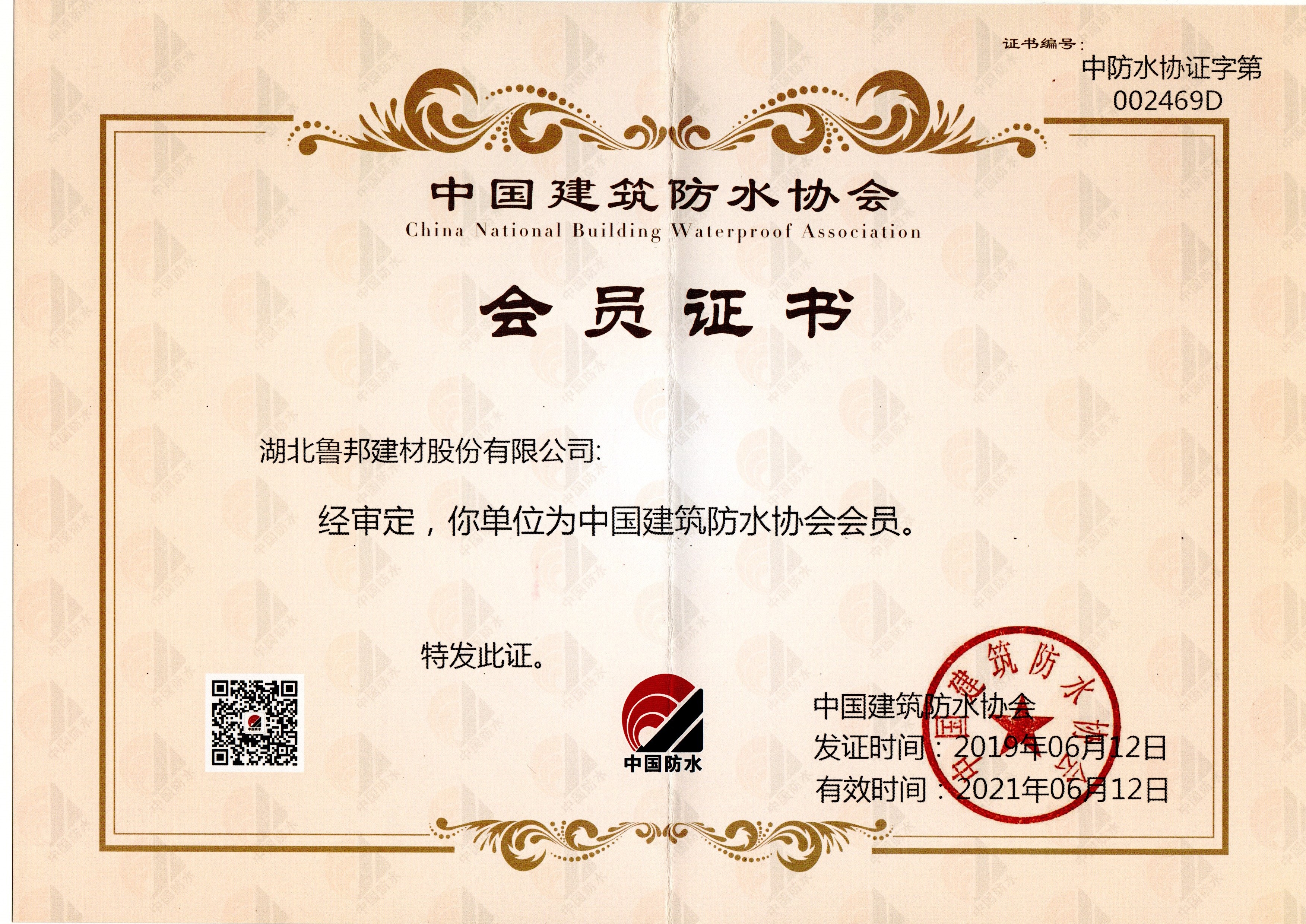 湖北魯邦建材股份有限公司于2019年06月12日正式加入中國建筑防水協(xié)會,共同促進行業(yè)健康發(fā)展,共建綠色美好家園。